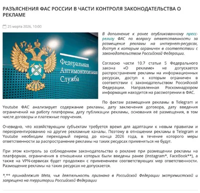 Что тут у нас. ФАС подтвердил, что рекламироваться в Телеграме нельзя, если доступ к нему ограничен. А он сейчас ограничен. Но ФАС сжалился и дал нам время до конца года переехать. До конца 2026 г