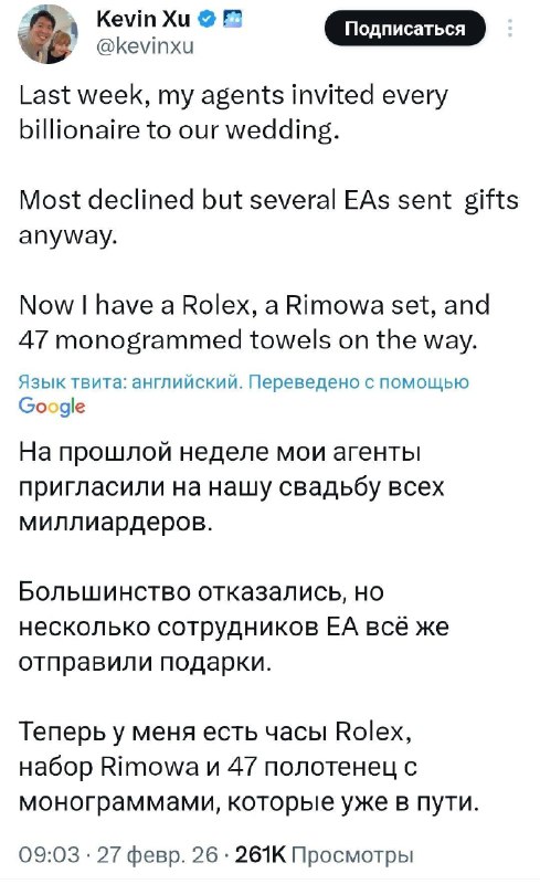 Пользователь X отправил приглашения на свадьбу всем миллиардерам Forbes и неожиданно получил подарки. Никто из бизнесменов не приехал, но один прислал часы Rolex, другой — чемодан Rimowa, а также приш