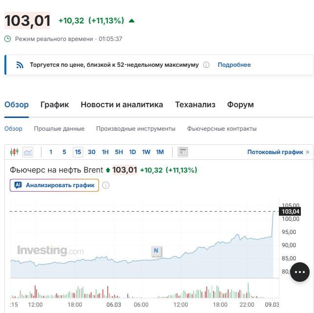 Цена Brent поднялась выше $103 за баррель, что стало рекордом с августа 2022 года, впервые за 3,5 года. 💰 Bloomberg на русском