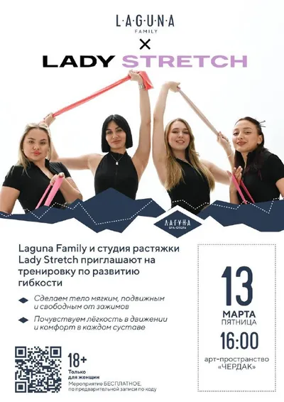 В ЭТУ ПЯТНИЦУ — LADY STRETCH х ЛАГУНА FAMILY 6 марта в 16:00 вместо занятия по фитнесу в рамках Laguna Family пройдёт особенный урок по растяжке совместно со студией LADY STRETCH. Арт-пространство C