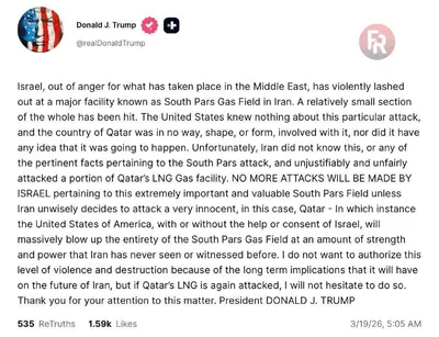 Трамп пригрозил Ирану уничтожением газового месторождения «Южный Парс», если атаки на Катар продолжатся Президент США заявил, что он ничего не знал про вчерашние удары Израиля по «Южному Парсу» в Ира