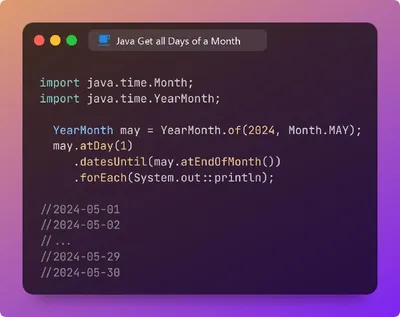 Совет по Java 💡☕️ Чтобы получить все дни месяца, вы можете начать с объекта YearMonth, получить его первый день, а затем использовать функцию datesUntil(), которая возвращает Stream всех дней до ука