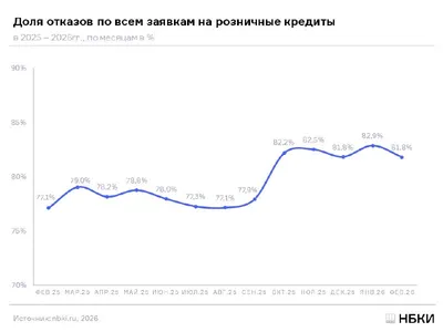 ❌ Доля отказов по заявкам на розничные кредиты в феврале составила 81,8% Это на 1,1% меньше, чем в предыдущем месяце. С октября 2025 года уровень отказов по заявкам на кредиты физлицам сохраняется на