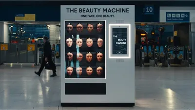Dove против алгоритмов 🤍 На лондонском вокзале Waterloo бренд установил инсталляцию The Beauty Machine — вендинговый аппарат, наглядно показывающий то, как соцсети формируют наше представление о вне