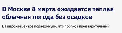 🌸 Ура, 8 марта в Москве ожидается без осадков, температура поднимется до +2°С Прогноз пока предварительный, сообщает Гидрометцентр. Это выходной, поэтому обязательно стоит выйти на прогулку. Плохо