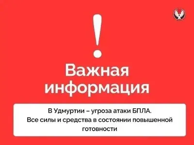 Внимание! Сигнал «Опасное небо»: угроза атаки БПЛА в южных районах Удмуртии. В случае обнаружения беспилотника: 👉 На улице Уйдите из зоны прямой видимости. Не паникуйте, спрячьтесь в ближайшем з