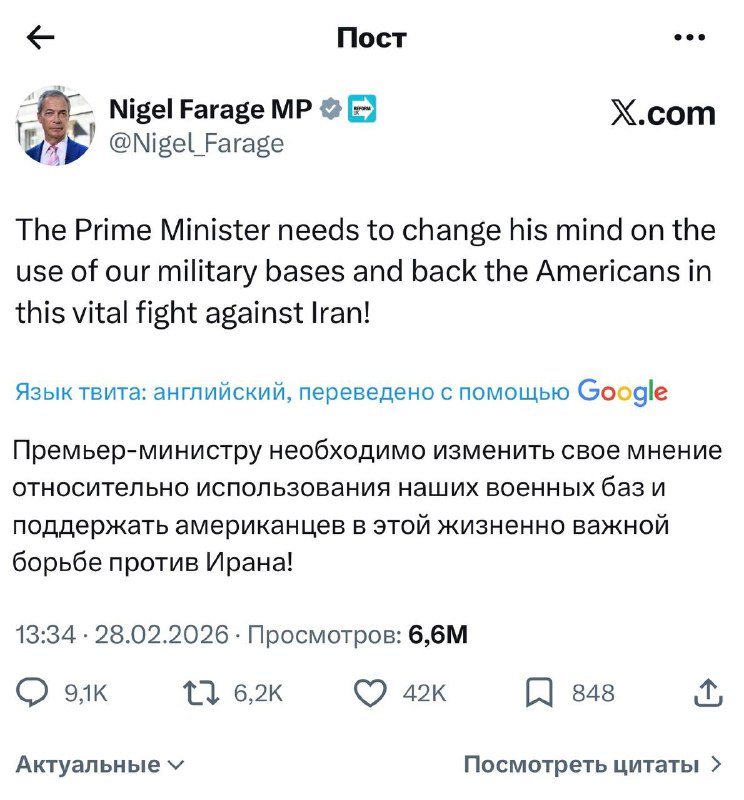Единственной британской политической силой, которая полностью поддержала операцию США/Израиля в Иране, стала Партия реформ. В этом смысле поражает, насколько Найджел Фарадж связывает политическую судь