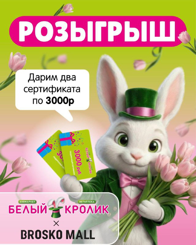 ДАРИМ ДВА СЕРТИФИКАТА ПО 3000₽ в ЗООМАРКЕТ «БЕЛЫЙ КРОЛИК» 🎁🐰🌷 Весна вдохновляет на яркие перемены! Самое время обновлять запасы питомцев новыми игрушками, вкусными лакомствами и полезными находка