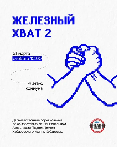 МЕРОПРИЯТИЯ B BROSKO 21 - 22 марта Бросковчане, а вот и анонс классных событий, которые пройдут у нас в комплексе уже на этих выходных! Дальневосточные соревнования по армрестлингу «ЖЕЛЕЗНЫЙ ХВАТ 2»