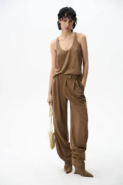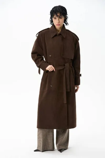 Серия изделий из материала схожего по свойствам и внешнему виду с натуральной замшей, которая подарит тактильный комфорт. Жакет, топ, брюки, юбка, тренч длины макси и миди в благородном песочном отте