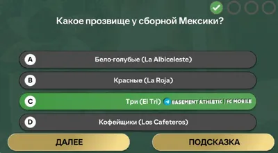 Правильные ответы на мексиканские вопросы в FC MOBILE в разделе нового мини события "История Наций"🇲🇽 1️⃣. Какое прозвище у сборной Мексики?🇲🇽 Правильный ответ - C. Три(El Tri) 2️⃣. Какой мексика