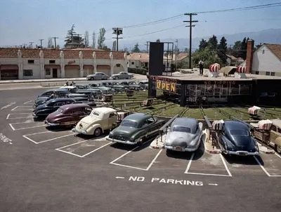 Ресторан быстрого питания The Track Drive-In, Лос-Анджелес, Калифорния, 1949 год. Заказы автомобилистов доставляли по конвейерной ленте с электрическим управлением в ресторане быстрого обслуживания.