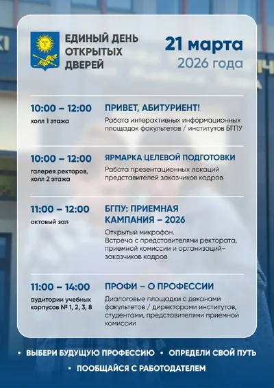 🟦🟦🟦🟦🟦🟦🟦🟦🟦 В БГПУ пройдет Единый День открытых дверей в рамках общереспубликанской акции «Я выбираю профессию» 🔔 Ждем вас 21 марта ↖️ Более подробно с программой можно ознакомится на сайте