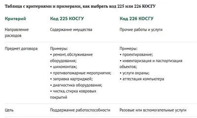 📝По каким критериям надо выбирать коды для работ и услуг При выборе между кодами 225 и 226 КОСГУ главные критерии — экономическая суть расходов и предмет договора. Чтобы использовать для расходов ко