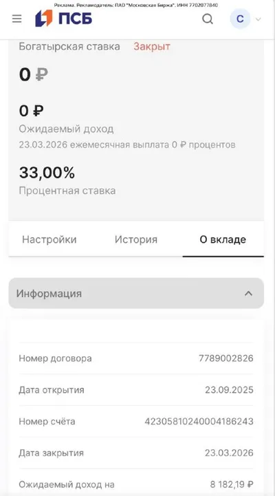 Сегодня закрылся мой вклад под 33% в банке ПСБ. Открывала его 6 месяцев назад. Сейчас таких ставок и в помине нет, но я всегда за то, чтоб пользоваться подобными предложениями 😀 На вкладе лежала час