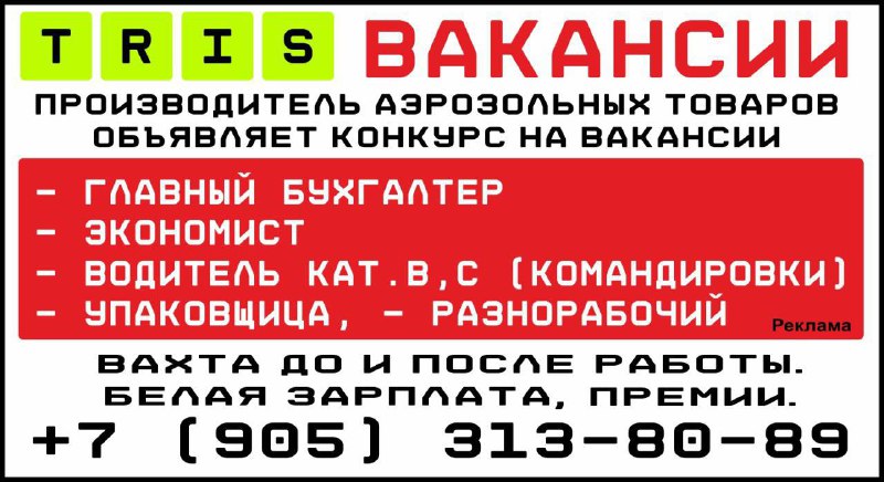 ВАКАНСИИ: ✔️ГЛАВНЫЙ БУХГАЛТЕР ✔️ЭКОНОМИСТ ✔️ВОДИТЕЛЬ кат .B,C(командировки) ✔️УПАКОВЩИЦА ✔️РАЗНОРАБОЧИЙ ☎️ 7 (905) 313-80-89