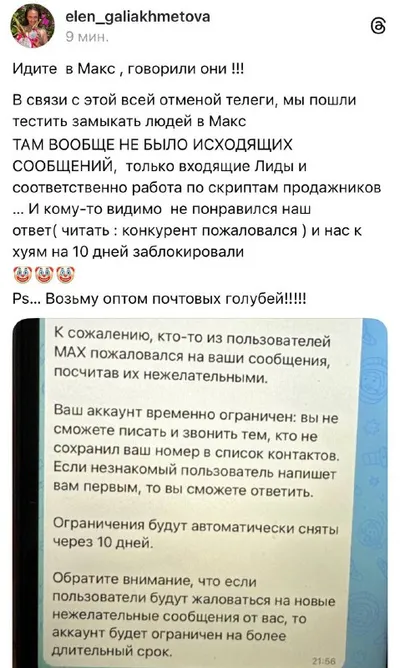 «Возьму оптом почтовых голубей». Предпринимательница решила вести лиды в Max, но получила бан на 10 дней – при том, что сама никому не писала, только отвечала на входящие заявки по скриптам. Она счи