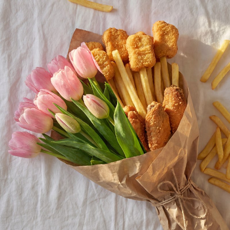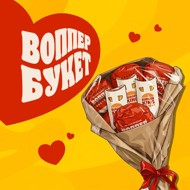 мальчик: семь розочек в целлофане мужчина: Воппер-букет Порадуй же наконец-то свою возлюбленную и закажи вкусный букет от Бургер Кинга. Что в составе? Шесть Вопперов, картошка, по три Вкусных штуки