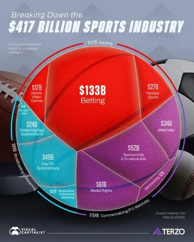 Интересная статистика: мировую спортивную индустрию оценивают в $417 млрд, и наибольшая доля доходов приходится на ставки — около $133 млрд. Также растут доходы от стриминга, подписок и видеоигр.