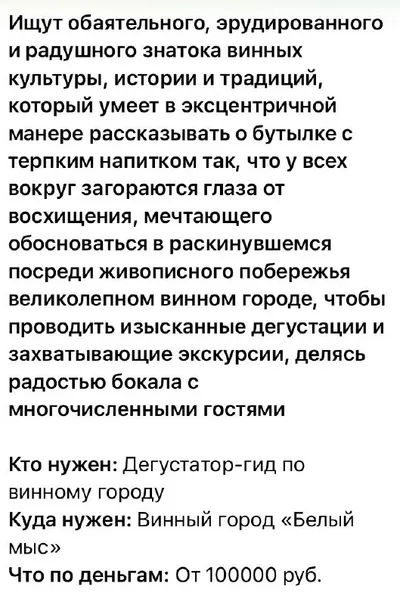 Гида-дегустатора за 100 тысяч рублей ищет винодельня в Геленджике Сотруднику предстоит водить экскурсии по местным виноградникам и погребам, заодно пробуя вино и советуя его гостям. Главное — умение