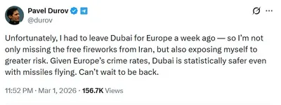 🇦🇪 #ОАЭ Дуров заявил, что несмотря на "фейерверки" Ирана, в Дубае безопаснее, чем в Европе 📍«К сожалению, неделю назад мне пришлось уехать из Дубая в Европу — поэтому я не только пропускаю бесплат