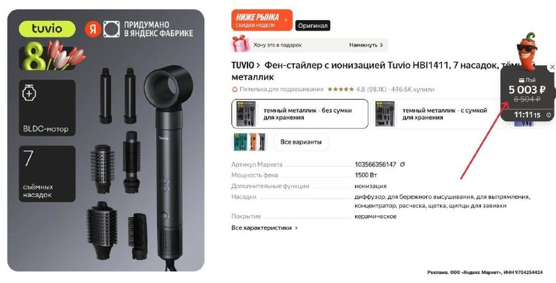 ❗️❗️При переходе будет 15 минут на оплату, главное примените промокод Фен-стайлер с ионизацией Tuvio HBI1411, 7 насадок, тёмный металлик 💳Со скидкой: 4503 ₽ / Промокод: FACTORY10PROMO ⭐ 4.8 (98.1K