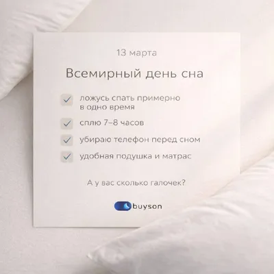 13 марта - Всемирный день сна😴 Звучит как лучший праздник из возможных 🤩 Без салатов. Без подарков. Просто лечь спать. Кстати, сам праздник появился в 2008 году по инициативе World Sleep Society.