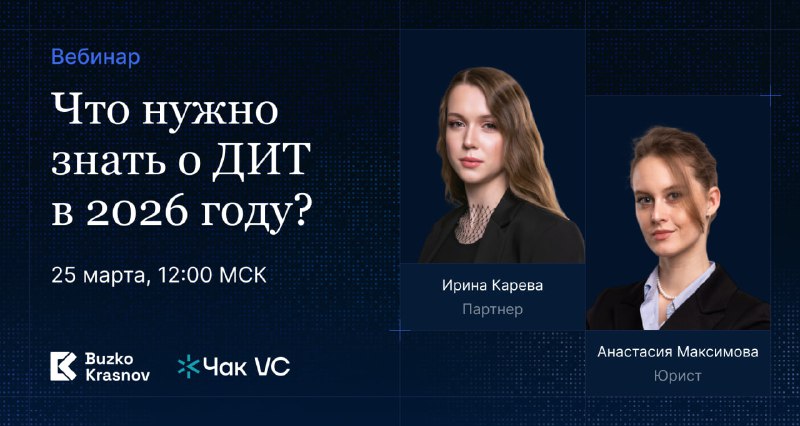 Вебинар «Что нужно знать о ДИТ в 2026 году?» Вдруг вы собирались, но откладывали. Уже завтра, 25 марта в 12:00 МСК проведем совместный вебинар Buzko Krasnov и Чак VC, посвященный договору инвестицион