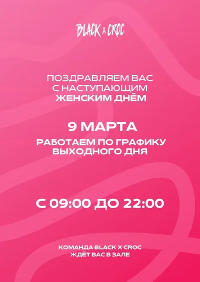 Друзья! 🌷 В связи с Международным женским днём, 9 марта работаем по графику выходного дня. Пожалуйста, учитывайте это при планировании посещения! Ждём вас на тренировки с 9:00 до 22:00 💪🏻