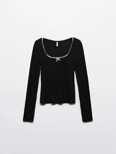 ❤️ Лонгслив в рубчик Однотонный лонгслив с окантовкой из белого кружева из новой зимней коллекции. Облегающий джемпер в рубчик станет основой женственных и сдержанных образов в школу, университет или