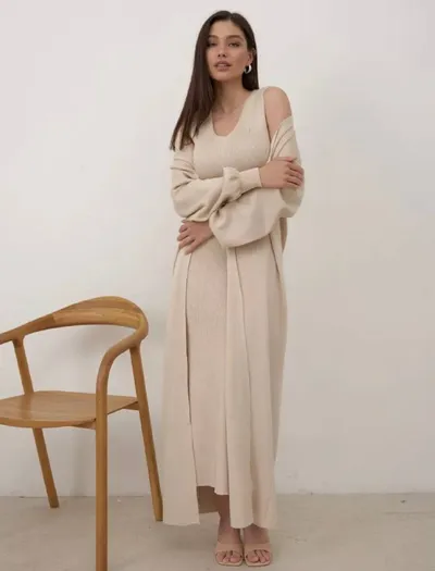 ❤️ Платье лапша Трикотажный вязаный костюмом двойка - идеальный комплект, состоящий из приталенного тянущегося платья лапша и элегантного кардигана в стиле оверсайз, предлагает вам множество возможно