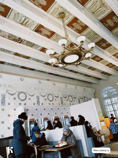 «Вкусно и точка» по-царски В здании железнодорожного вокзала в городе Пушкин открылся филиал «Вкусно и точка». Привычного интерьера здесь нет, вместо него — фарфоровое панно с цветочными гирляндами.