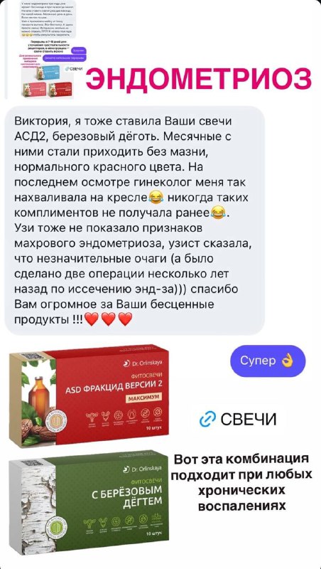 ЭНДОМЕТРИОЗ: золотая тройка свечей! Это свечи работают комплексно, существенно уменьшает воспаление в органах малого таза. ✅ Без гормонов ✅ Без привыкания ✅ Без нагрузки на печень ASD фракцид очищ