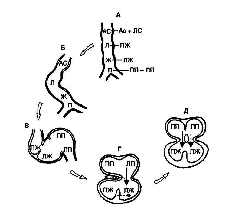 Образование четырехкамерного серца из сердечной трубки. А. Сердечная трубка, состоящая из четырех отделов (формируется на первом месяце внутриутробного развития). Из первичного предсердия в будущем о