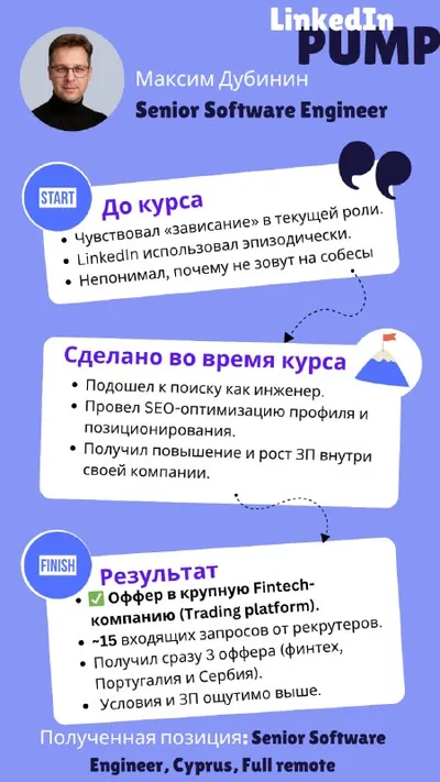 🔥 Оффер на Senior Engineer + Full Remote Fintech Очень классный кейс Макса, который показал, что системность и трудолюбие побеждают всегда. Макс заходил к нам на LinkedInPUMP 2 раза, но не буду спо