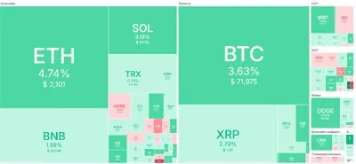 🟠🔼Крипторынок. Рост. 🪙Bitcoin (BTC) в моменте превысил 74 тыс.$. 🪙Ethereum (ETH) дотянулся до 2200$. Весь крипторынок ощутил позитивный растущий импульс. Отличалась только амплитуда роста. Что п