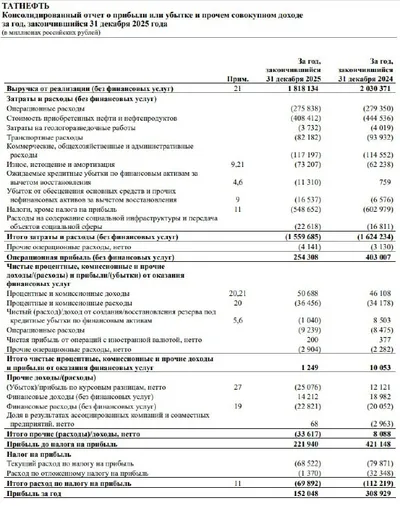 ⛽️Компания Татнефть опубликовала финансовый отчет по МСФО за прошлый год. 1) Выручка от реализации составила 1,82 трлн. рублей, показав снижение год к году на 10,50%. 2) Операционная прибыль просе