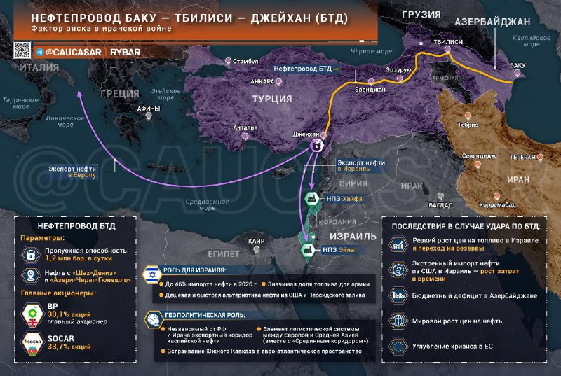 📝Ахиллесова пята Израиля📝 на Южном Кавказе На фоне военной эскалации вокруг Ирана все больше разговоров о том, что в Тегеране потенциально могут ударить по нефтепроводу Баку — Тбилиси —Джейхан (Б