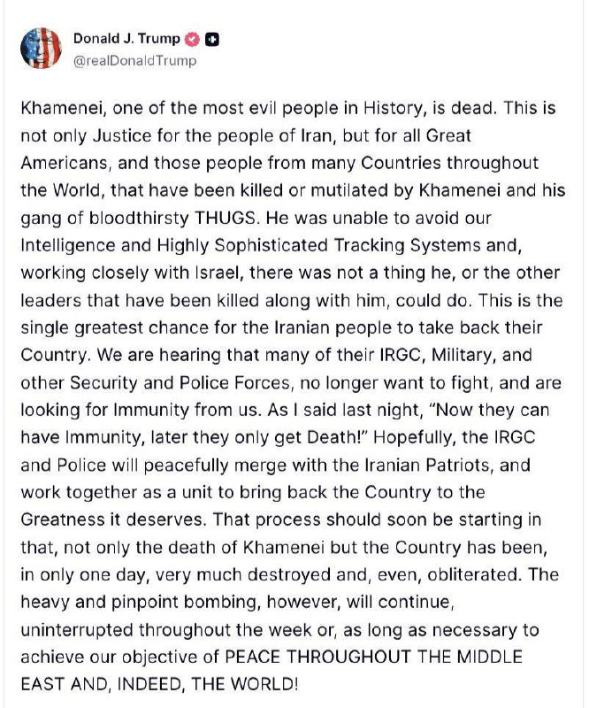 🇺🇲🇮🇷 Дональд Трамп подтвердил смерть верховного лидера Ирана Али Хаменеи. По словам президента США, многие представители КСИР, вооружённых сил, а также других сил безопасности и полиции Ирана бол