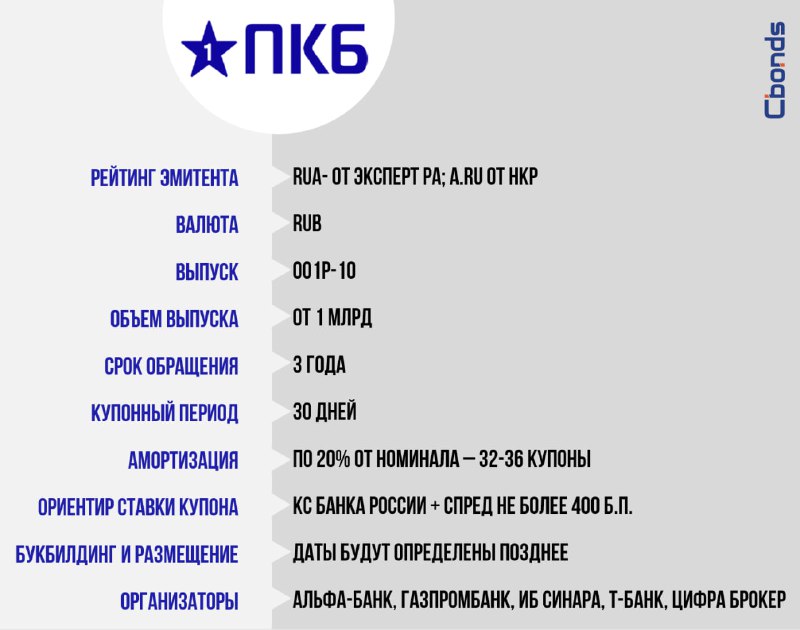 #Премаркетинг 💰ПКБ, 001P-10 (от 1 млрд) Даты сбора заявок и размещения будут определены позднее. Доступно для приобретения квалифицированными инвесторами. 📝Облигационный долг Эмитента: 9.9 млрд