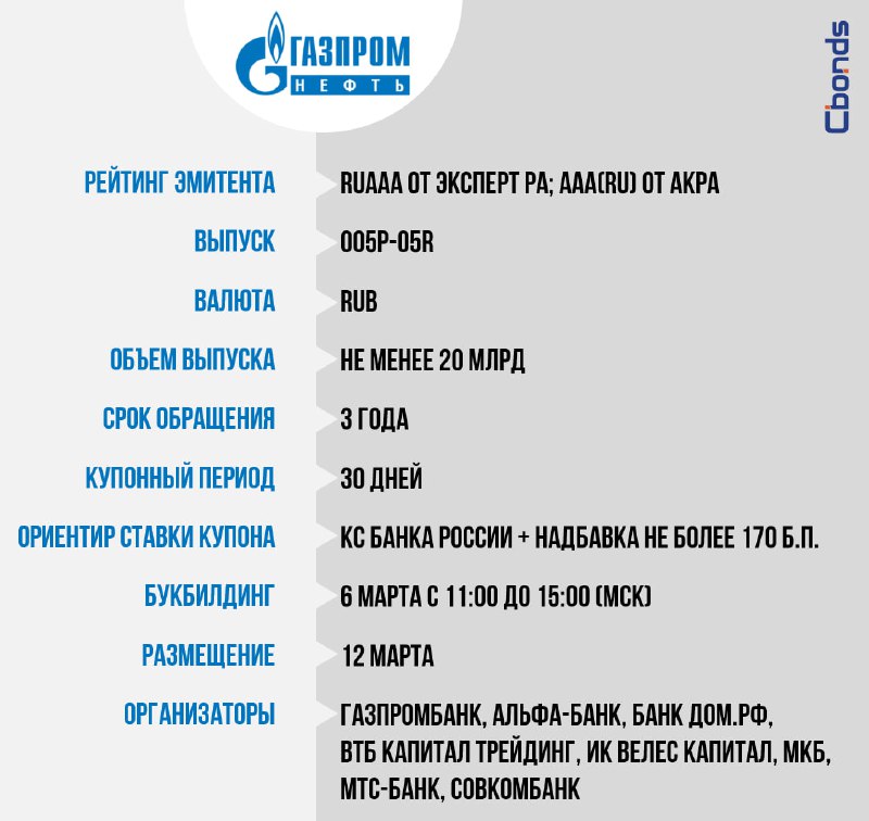 #Премаркетинг ⛽️ «Газпром нефть», 005Р-05R (не менее 20 млрд) Сбор заявок – 6 марта с 11:00 до 15:00 (мск), размещение – 12 марта. 📝Облигационный долг (вкл. ЦФА) Эмитента: 635.5 млрд руб., 4.25 мл