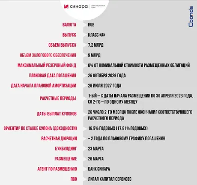 #Премаркетинг 💳 СФО СИНАРА СЕКЬЮР, класс «А» (облигации с залоговым обеспечением, 7.2 млрд) Сбор заявок – 23 марта, размещение – 26 марта. Call-опцион – в любую дату выплаты, следующую за датой вы