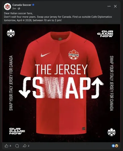 ✍️ На днях сборная Италии снова пролетела мимо ЧМ по футболу. А сборная Канады, принимающая участие в турнире, предложила большой итальянской диаспоре в своей стране бесплатно обменять футболку Италии