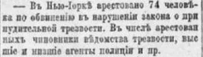 В Нью-Йорке арестовано 74 человека по обвинению в нарушении закона о принудительной трезвости. В числе арестованных чиновники ведомства трезвости, высшие и нижние агенты полиции и пр.