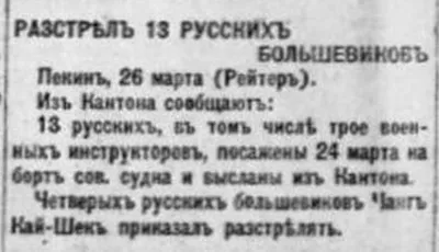 Расстрел 13 русских большевиков. Из Кантона сообщают: 13 русских, в том числе трое военных инструкторов, посажены 24 марта на борт сов. судна и высланы из Кантона. Четверых русских большевиков Чанг Ка