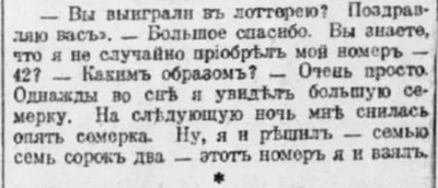 — Вы выиграли в лотерею? Поздравляю вас. — Большое спасибо. Вы знаете, что я не случайно выбрал мой номер — 42? — Каким образом? — Очень просто. Однажды во сне я увидел большую семерку. На следующую н
