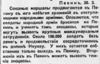 Союзные маршалы продвигаются к Пекину с юга избегая сражений с отступающими народными армиями. Опасаются, что солдаты народной армии бросятся на Пекин и учинят там эксцессы, которые могут вызвать круп