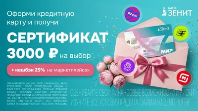 Кредитная карта Банка ЗЕНИТ с подарочным сертификатом на 3000₽ в Ozon, «Магнит», Wildberries или «Золотое яблоко» и кэшбэком 25% на маркетплейсы* Как получить сертификат: - перейдите по ссылке и офор