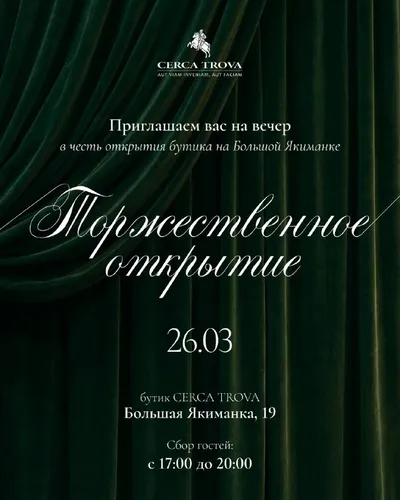 Дорогие друзья, благодарим Вас за то, что разделили с нами этот прекрасный вечер по случаю открытия нового бутика Cerca Trova! Ссылка на фотографии с мероприятия — https://disk.yandex.ru/d/QEZb8LoAa