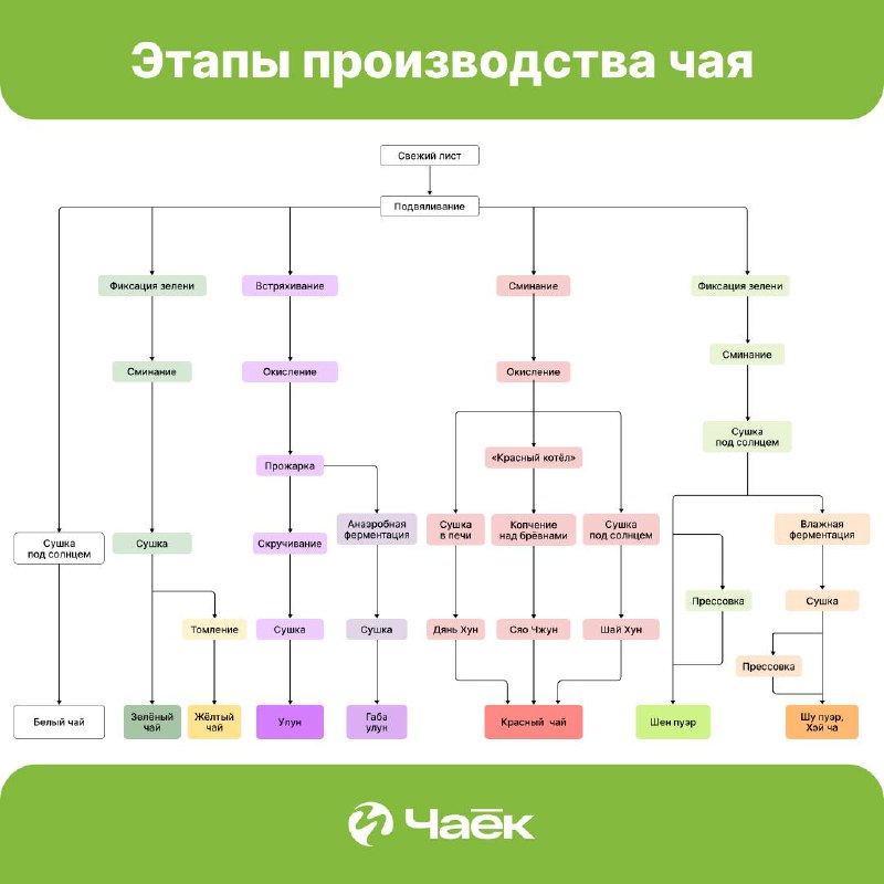 1 лист = 8 чаёв Как такое возможно? Всё дело в обработке! Знакомые чёрный и зелёный — лишь часть огромной чайной палитры, в которую ещё входят улун, пуэр, белый, красный и жёлтый чаи. Всё многообр